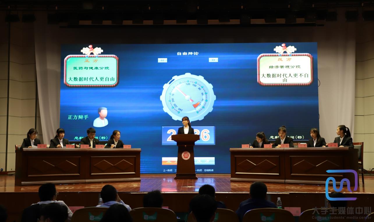 本次辩论赛的主题是“大数据时代人更自由还是更不自由”,正方为医药与健康分院,他们的观点是“大数据时代人更自由”,反方为经济管理分院,他们的观点是“大数据时代人更不自由”。双方一辩开宗明义,在立论环节详细阐述了各自的观点,为整场辩论的开展奠定了坚实的基础。在攻辩和自由辩论环节双方唇枪舌战,你来我往,特别是自由辩论环节将整场辩论赛推向了高潮。正方举出百度、淘宝等实例不断巩固“大数据时代人更自由”的论点。反方采用巧妙的辩论技巧不断攻破对方论点来证明“大数据时代人更不自由”。正方双方辩手的妙语连珠,机智反驳,赢得场下观众阵阵掌声。总结陈词中,双方四辩进一步指出对方漏洞,巩固立论,赢得了满堂喝彩!最终,经济管理分院荣摘本届辩论赛的冠军,医药与健康分院获得亚军,杨沪难同学和赵凌同学获得最佳辩手。