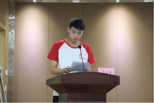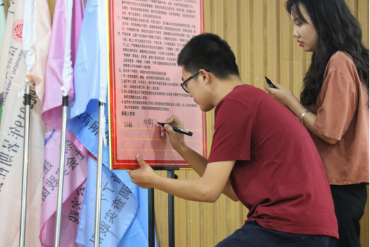 带队老师卢小盼和暑期社会实践团队学生代表李京哲和程毅超同学分别从各自角度做了表态发言,卢老师从指导教师角度强调:要密切关注学生动态,加强对学生暑期社会实践的指导。学生代表纷纷表示要利用暑期社会实践的机会,不断增长才干,提升自身综合素质。15支学生队伍依次上台签订了暑期社会实践承诺书,并接受授旗。
