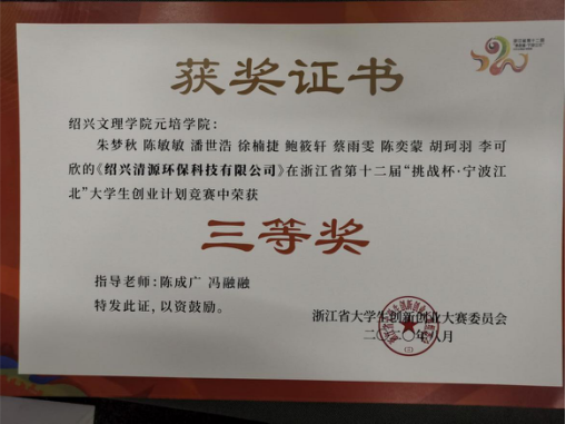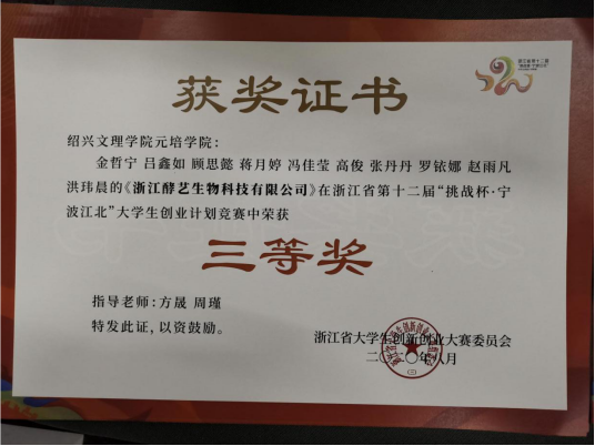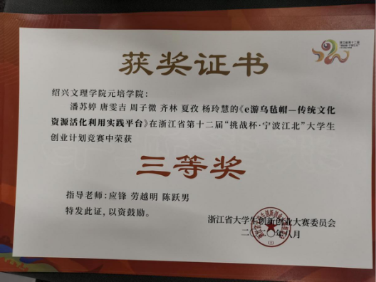 经团队申报、院级选拔、省级竞赛,学院共推荐6项作品参加第十二届“挑战杯”大学生创业计划竞赛。在省赛评选中,最终《浙江酵艺生物科技有限公司》(项目成员:金哲宁、吕鑫如、顾思懿、蒋月婷、冯佳莹、高俊、张丹丹、罗铱娜、赵雨凡、洪玮晨;指导老师:方晟、周瑾)、《e游乌毡帽-传统文化资源活化利用实践平台》(项目成员:潘苏婷、唐雯吉、周子微、齐林、夏孜、杨玲慧;指导老师:应锋、劳越明、陈跃男)、《绍兴清源环保科技有限公司》(项目成员:朱梦秋、陈敏敏、潘世浩、徐楠捷、鲍筱轩、蔡雨雯、陈奕蒙、胡珂羽、李可欣;指导老师:陈成广、冯融融)三个项目分别获得了浙江省三等奖的成绩。