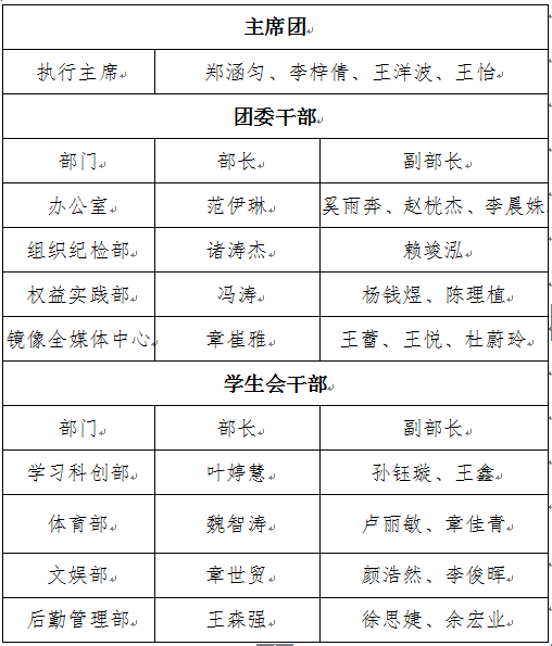 在学院党委领导和团委指导下,绍兴文理学院元培学院学生会开展了新一期学生干部换届选拔工作。经学生自主报名、组织推荐、资格审查、面试竞选、综合考察等环节,对拟任命的第十四届院学生会主要干部名单公示三日无异议情况下,现将最终名单予以公示: